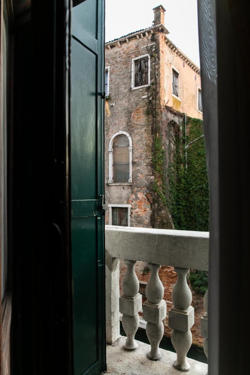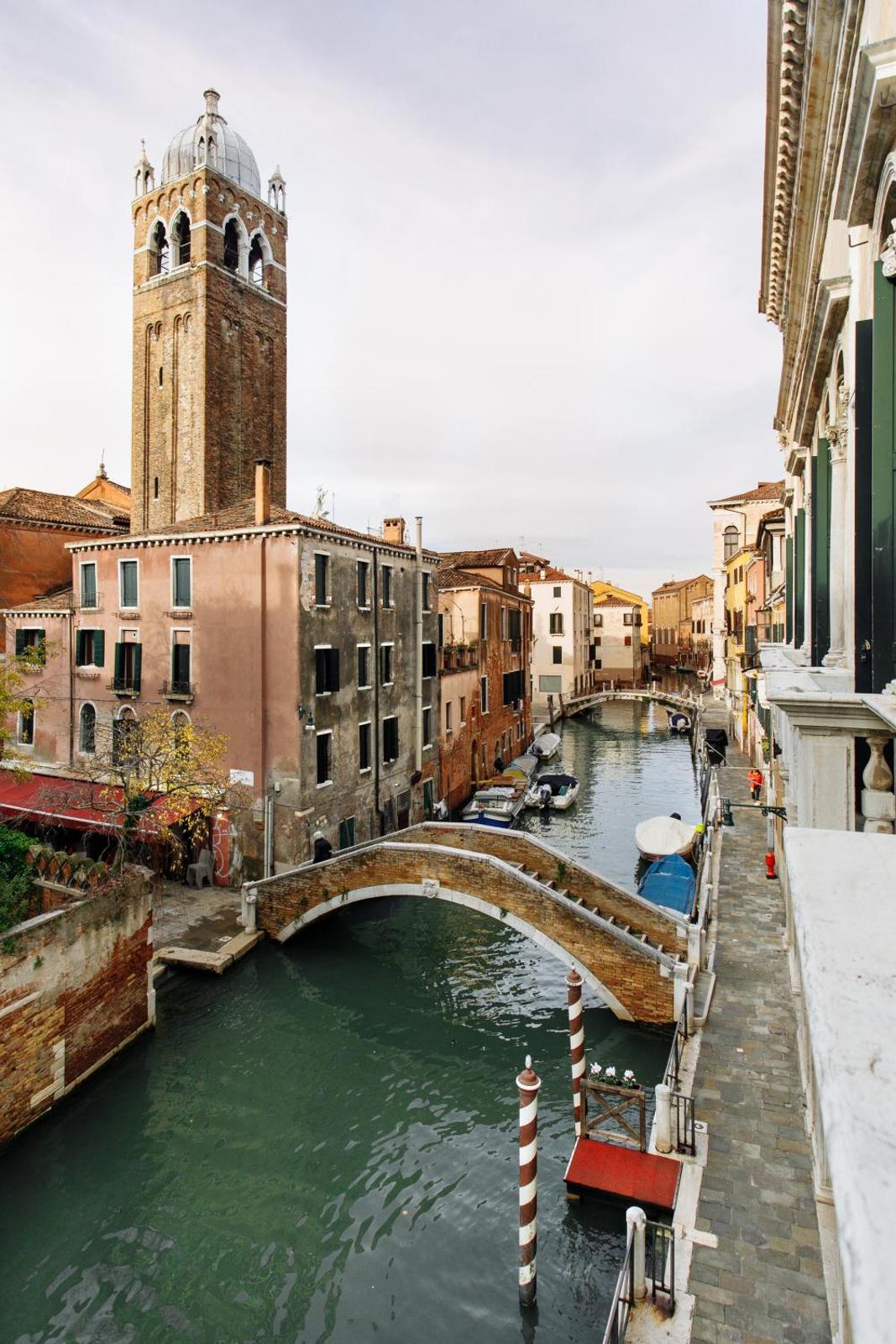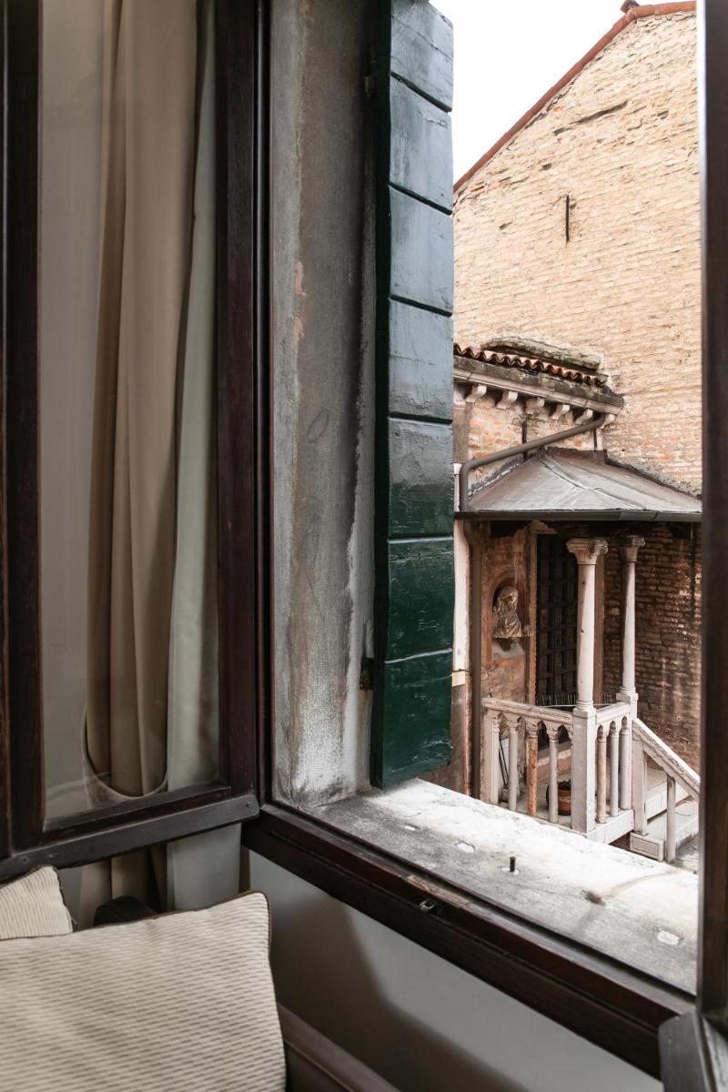 Images of the canal highlight the property’s quiet yet central setting, while room views show spa baths, fresco details, and antique furniture that ground the hotel in Venice’s long artistic tradition.